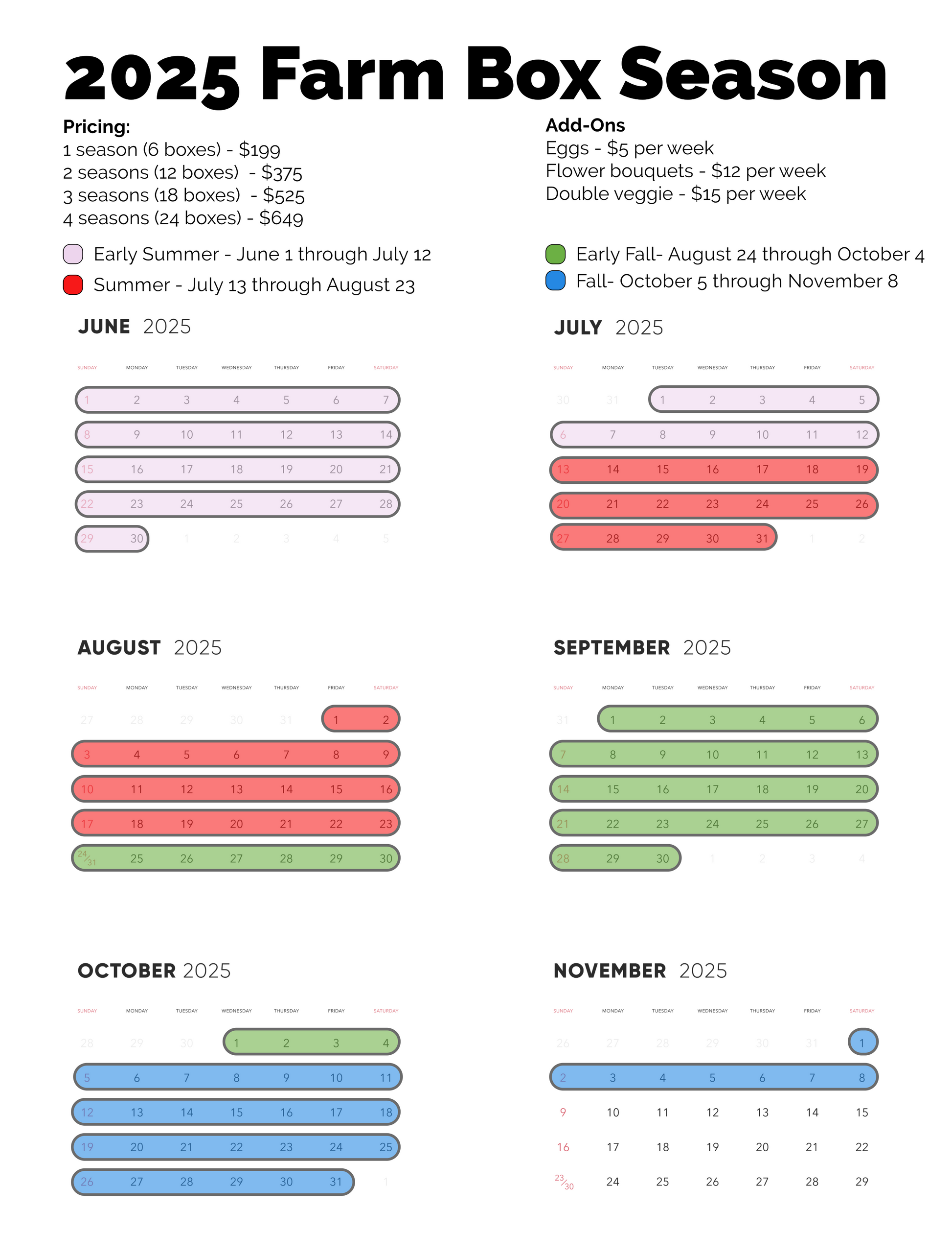Please let us know what seasons and add-ons you'd like to reserve spots in with the "Order special instructions" section at checkout.